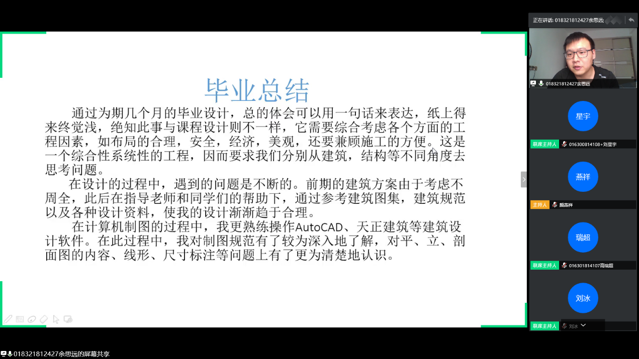 员工首先在线演示PPT,阐述论文的选题依据、基本思路、研究方法、创新点、研究结果与分析等。利用5分钟的时间对自己的设计(论文)进行全面的陈述。答辩小组老师逐一进行点评和提问,就设计(论文)中存在的主要问题提出了修改意见或建议,员工在线并逐一回答答辩成员提出的问题。