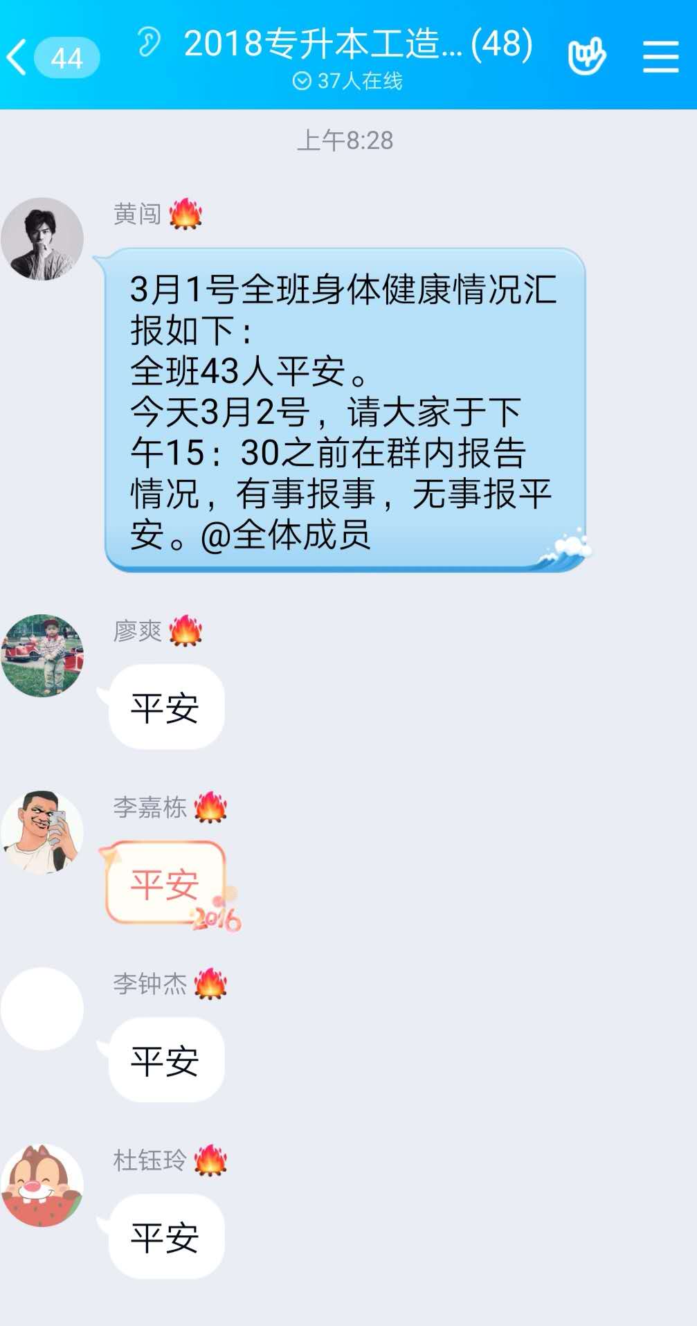 全面摸排,严格落实。学院对员工健康情况不留死角,全面摸排,落实“员工-班主任-辅导员-学院-学校”五级联报制度,要求班主任、辅导员通讯畅通,24小时在岗在线,密切关注员工的身体健康、心理健康、思想动态等。